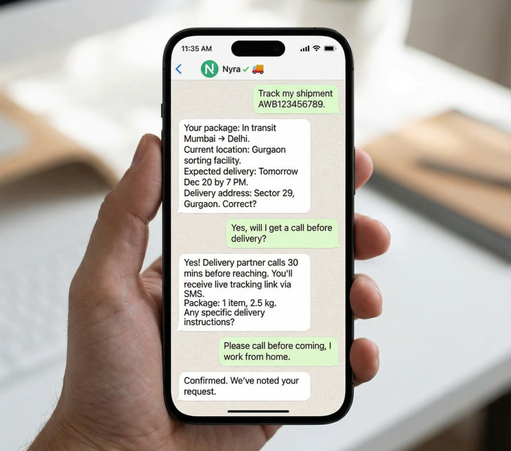 • NyraAI Voice Bot automates inbound and outbound calls so customers can speak naturally to resolve queries, check statuses, or complete transactions without waiting on an agent.